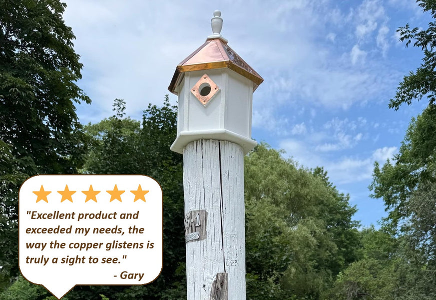 Amish handmade birdhouse, 2 nesting compartments, 6 sided, white, with copper roof, crafted with precise details and high quality materials, ensures shelter for your feathered friends and will transform any flower garden, yard, or nature sanctuary into a peaceful oasis filled with birds!