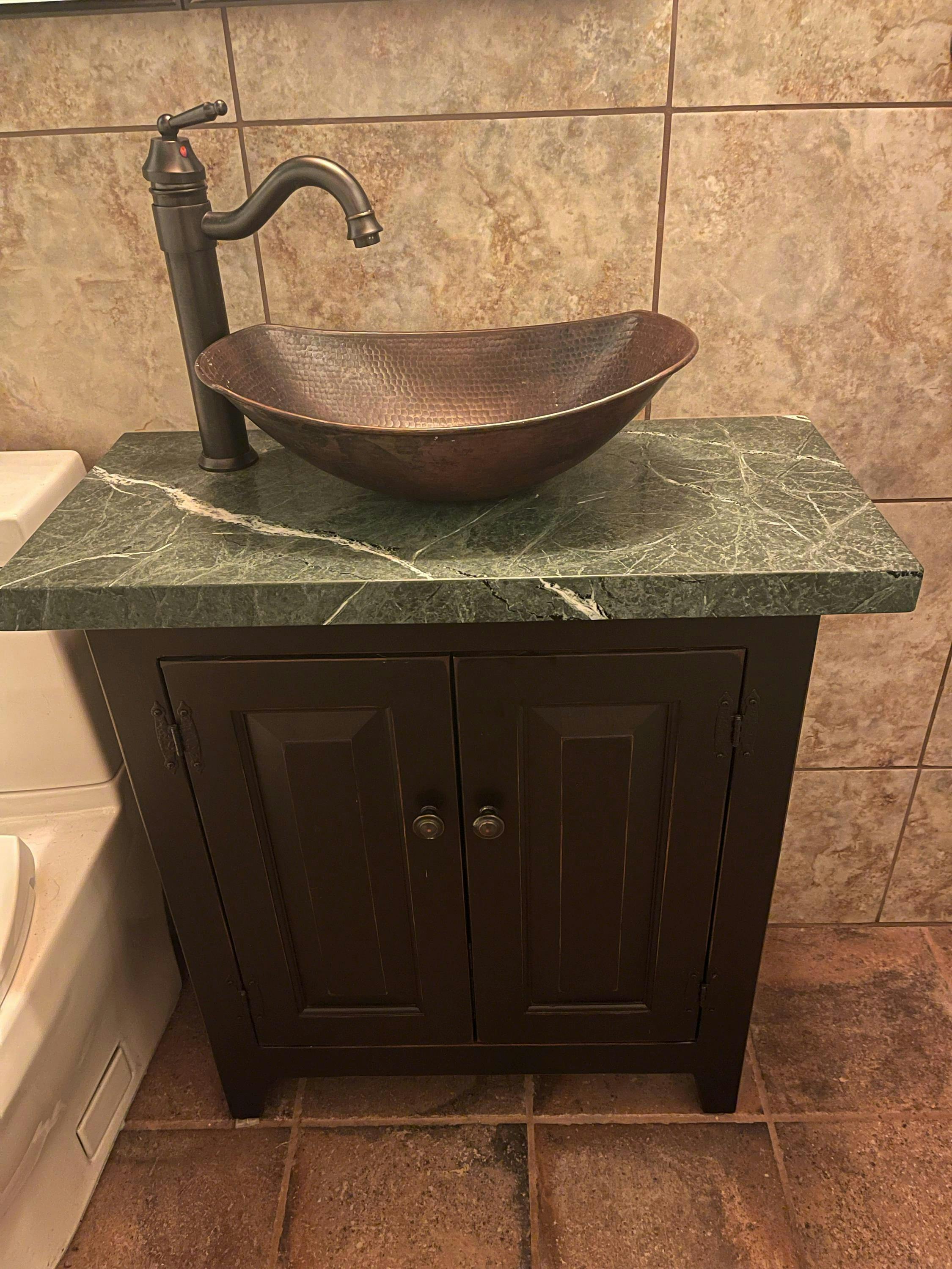 4. Countertop overhangs 1" on the left, right, and front side, and the back of the countertop is flushed with the base.