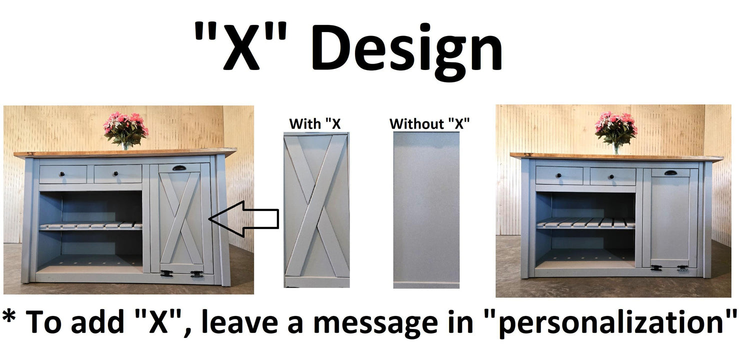 Build your custom kitchen island based on your design preference for shelving, doors, drawers, and tilt-out trash can options, as shown in the white kitchen island image, please leave a message before placing your order.
