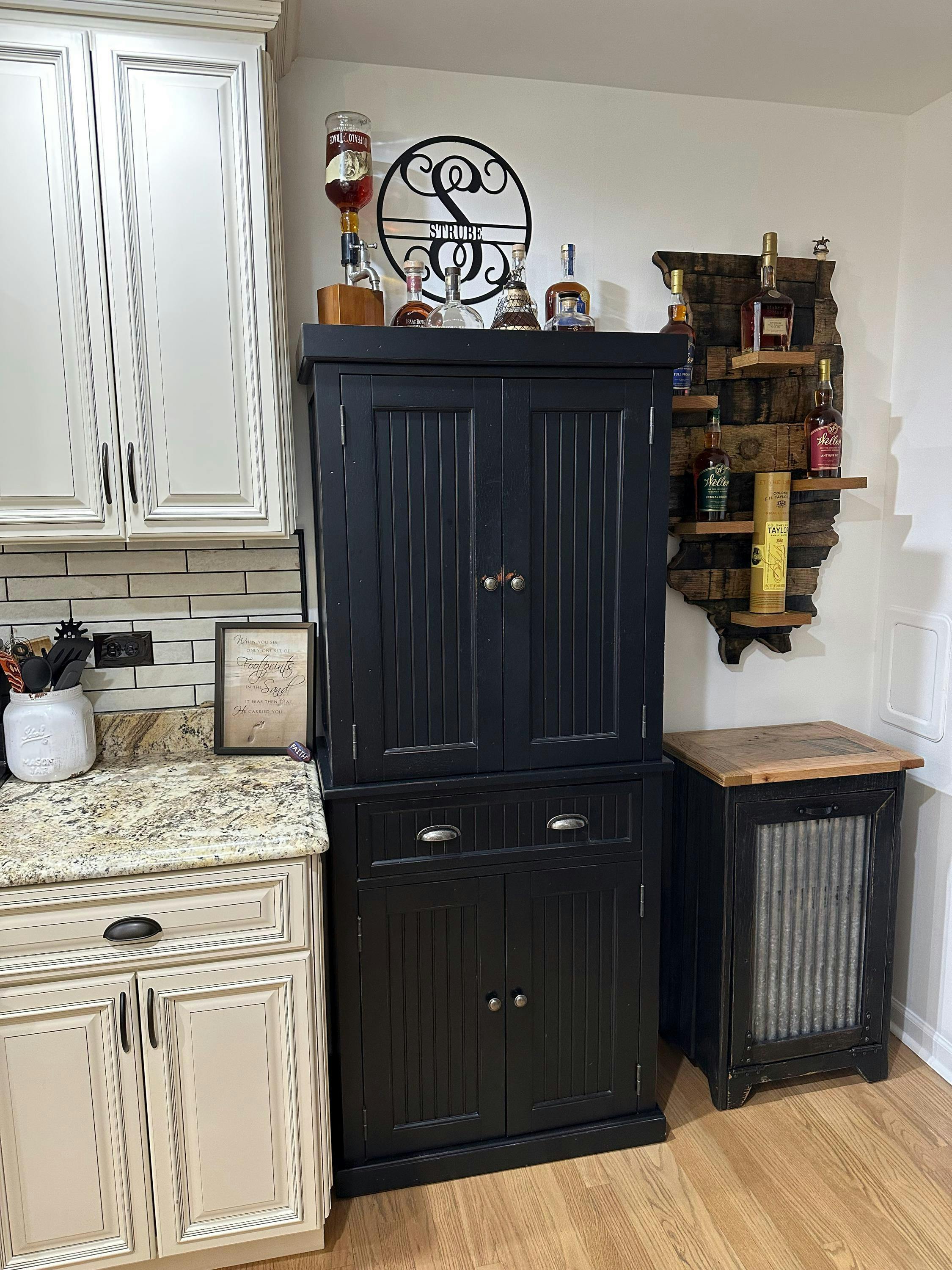 3. Material: Reclaimed wood, reclaimed tin (for trash bins with tin door).