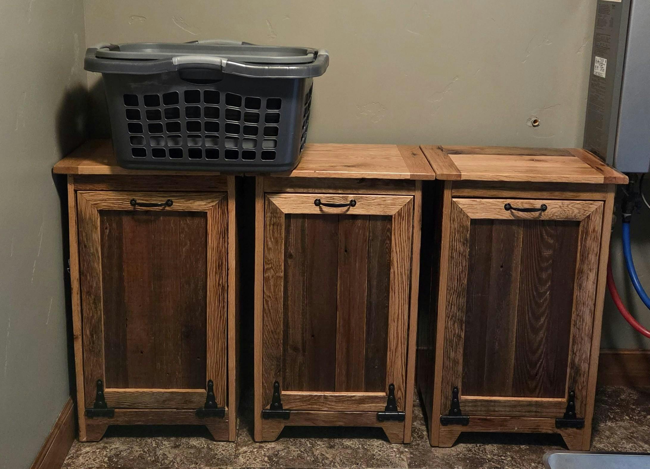 3. Material: Reclaimed wood, reclaimed tin (for trash bins with tin door).