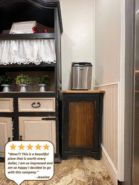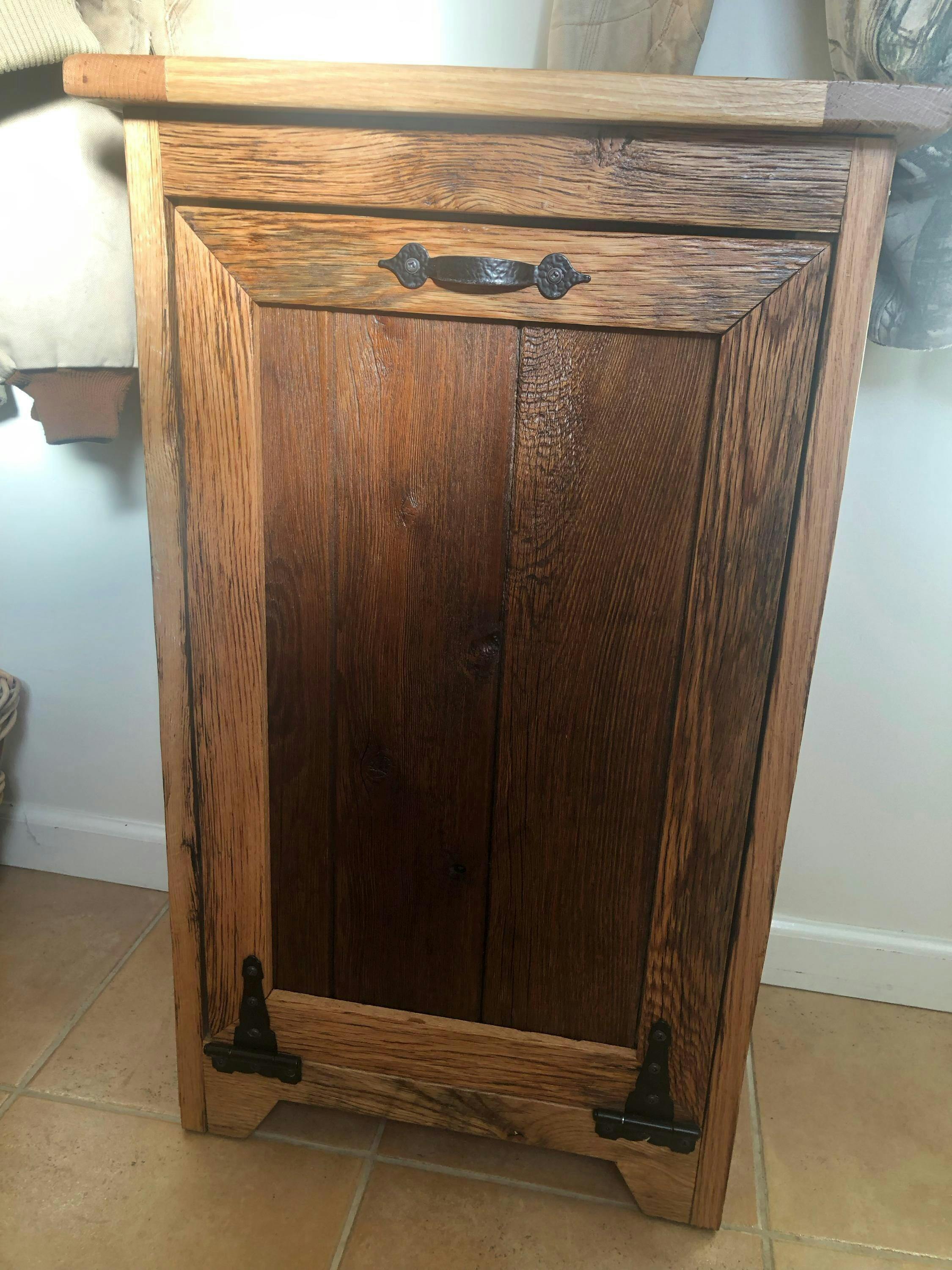 Wood trash bin, reclaimed, this amazing tilt out trash can cabinet is functional yet well-made to perfection using recycled material. Amish Handmade.