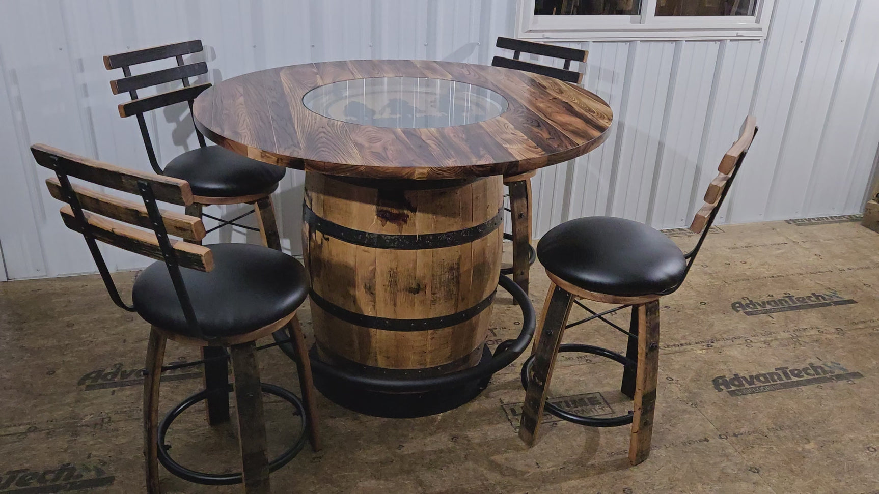 Barrel Bar Table - Amish Handmade - Counter Table - Bar Chairs - Farmhouse Furniture - Swivel Chairs - Cushion Seat - Whiskey Barrel- Rustic