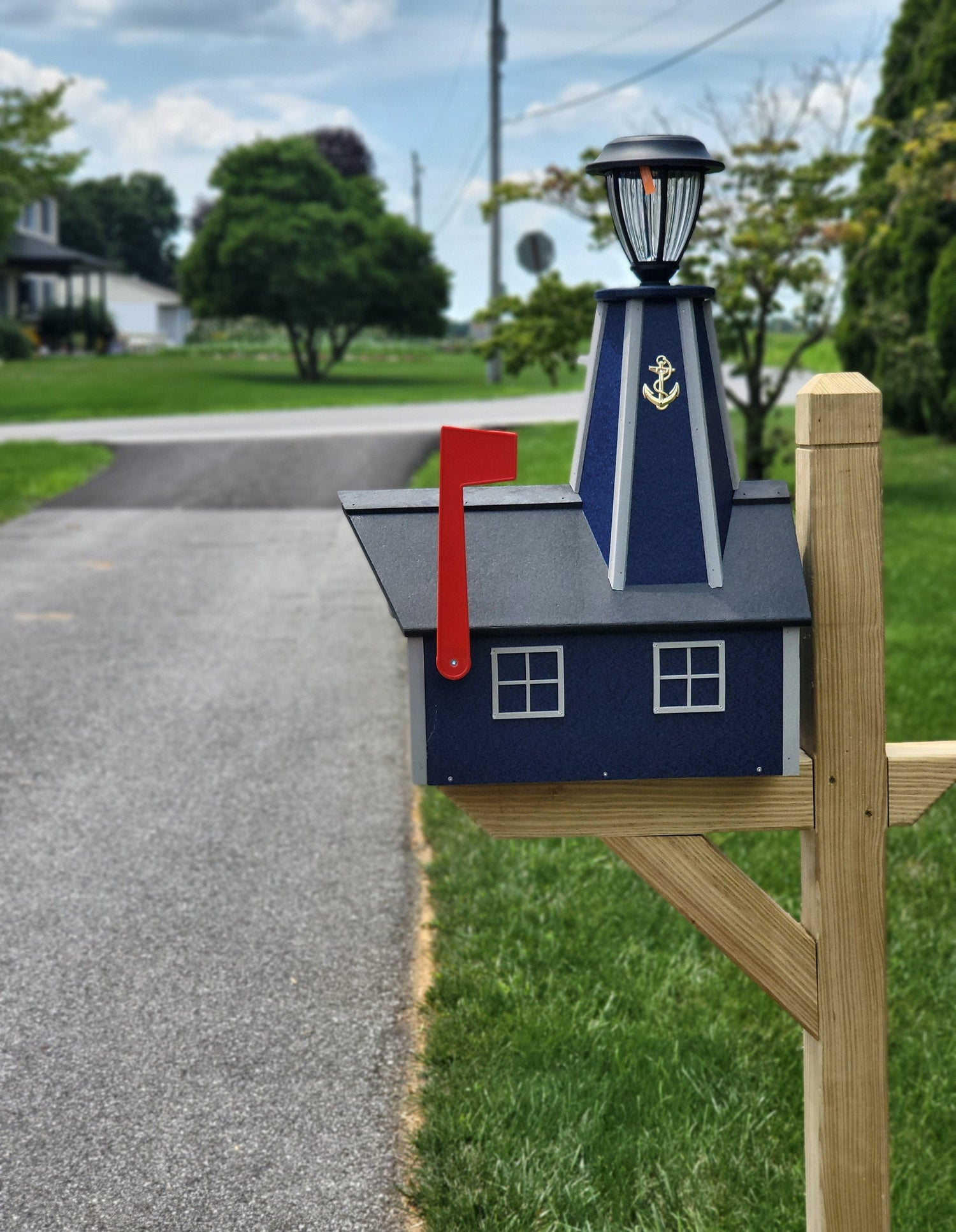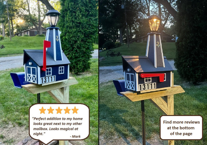 This well-made, weather-resistant, Amish mailbox with solar lighthouse, is focused on beauty and quality!