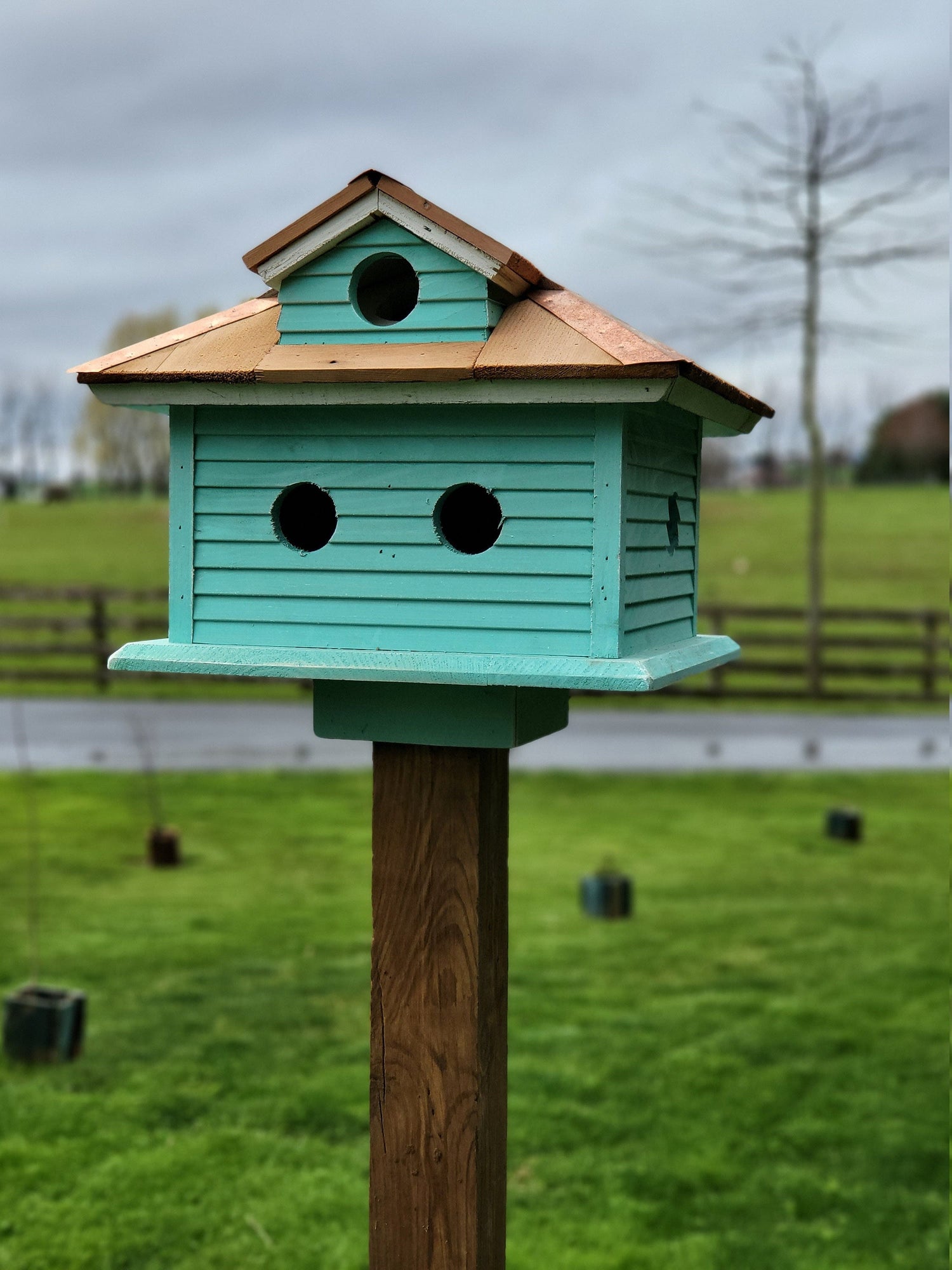 Amish Handmade Purple Martin Birdhouse features a stunning cedar roof and elegant copper trim, offering 5 spacious nesting compartments. Perfect for outdoor use, it provides a safe and comfortable home for Purple Martins. Crafted with care, this durable birdhouse combines rustic charm with lasting quality, making it a beautiful addition to any garden or yard.
