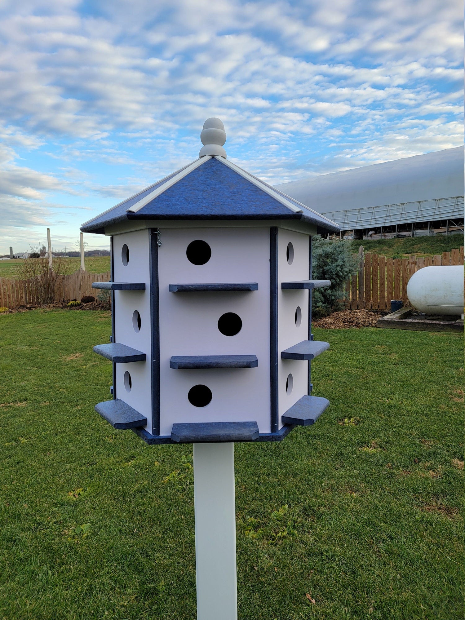 X-Large Amish Handmade Birdhouse, features 18 spacious nesting compartments. Crafted from durable, weather-resistant poly lumber, this birdhouse is built to withstand the elements, ensuring long-lasting use year after year. Its carefully designed structure provides a safe and cozy space for Martins to nest and thrive. Perfect for bird enthusiasts, this birdhouse combines functionality with a beautiful, rustic charm, making it a standout addition to your outdoor space.