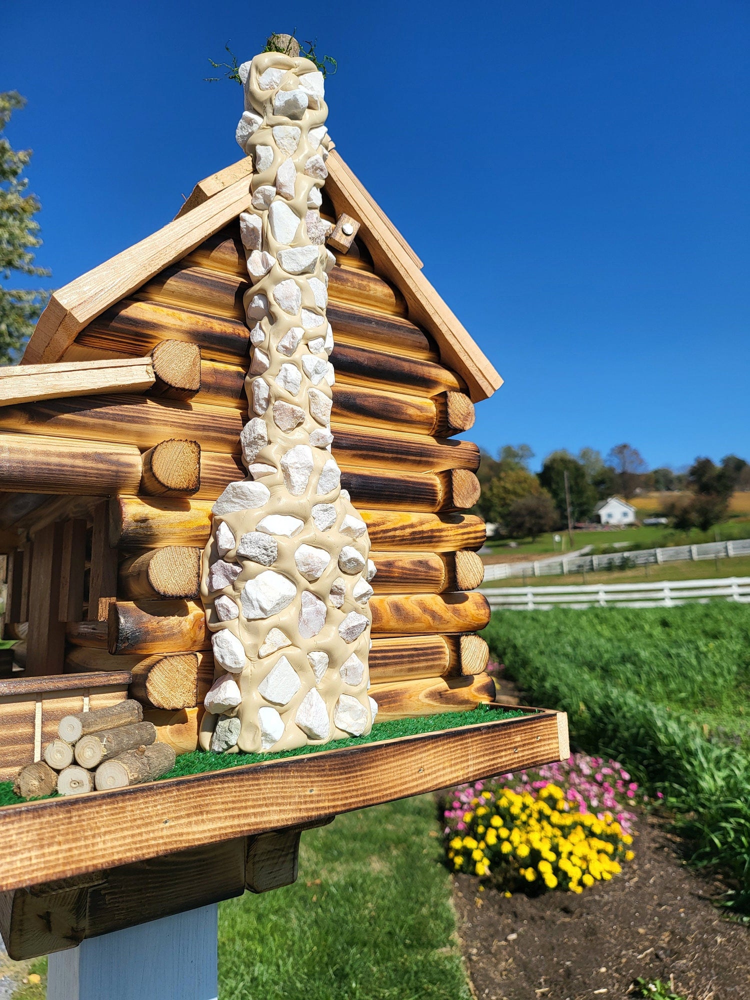 Log Cabin Birdhouse, Amish Handmade, Rustic, 2 Nesting Compartments With Cedar Roof, Yellow Pine, and Stone Chimney