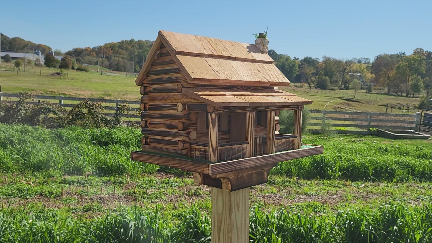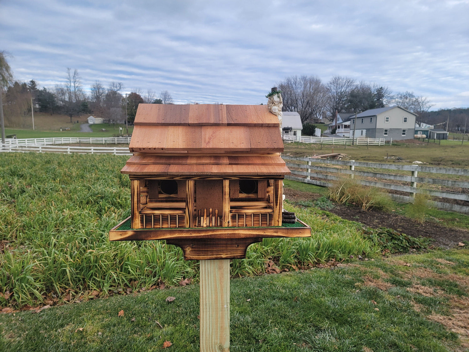 Beautiful outdoor decor, Amish Handmade! Wooden log cabin birdhouse with 2 nesting compartments.