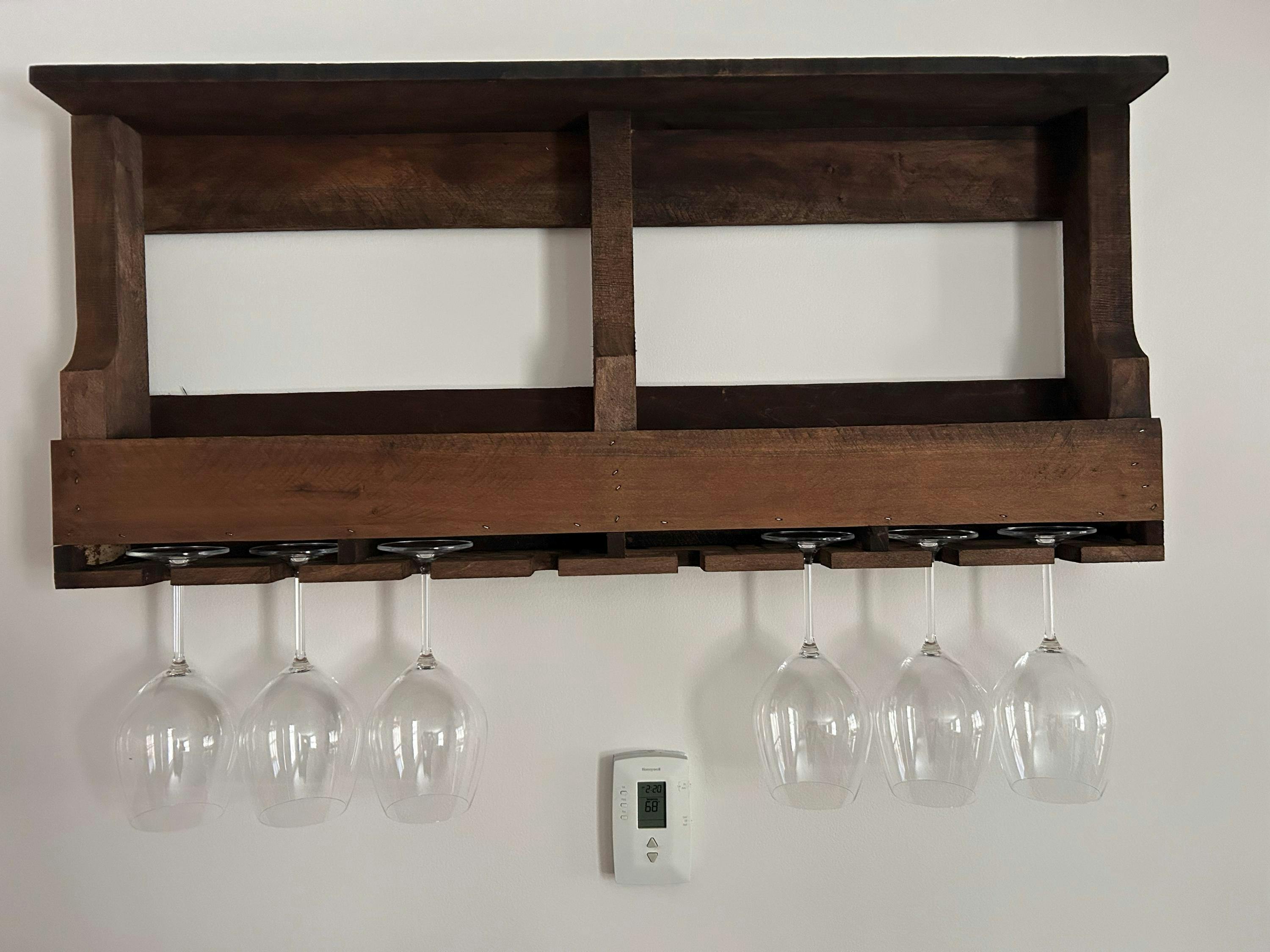Rustic Wine Shelf - Wall Mounted - Amish Handmade Wine Holder - Wine Display With Glass Holder - Gifts - Bar Rack- Wooden Bottle Holder