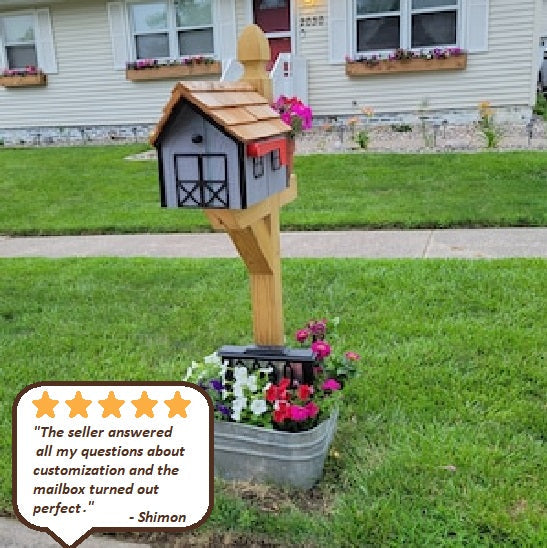 Amish Mailbox Dark Gray - Handmade - Wooden - Barn Style - With a Tall Prominent Sturdy Flag - With Cedar Shake Shingles Roof - Mailbox only / Navy blue is backordered and will ship as soon as it is back in stock.